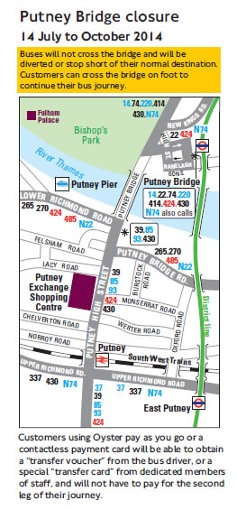For the duration of the Putney Bridge works buses will operate a shuttle service from both ends. This means that passengers will have to cross the bridge on foot and get on another bus to continue their journeys.