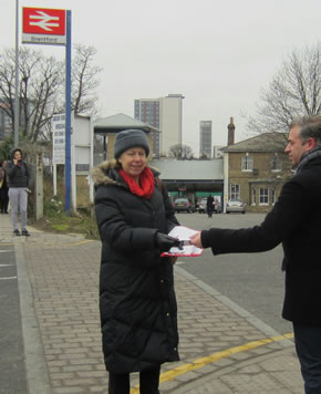 Cllr Ruth Cadbury distributes leaflets at Brentford