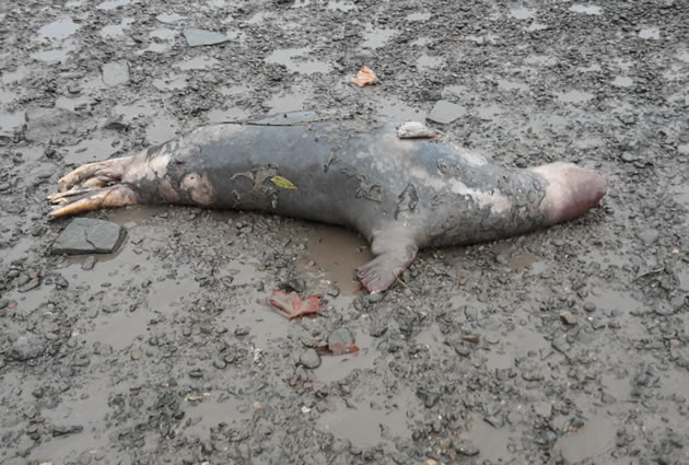 Dead seal on Chiswick foreshore after previous sewages discharge. Picture: Val Bott