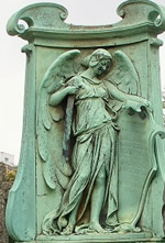 The listed memorial is is to George Broad, who died in 1895, and his wife and depicts an angel with a sword and holding an inscribed Renaissance shield.