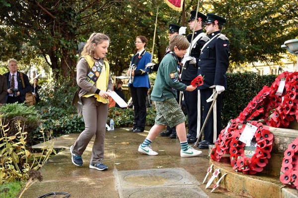 Members of local Brownies and Cubs lay poppies at Fulham War Memorial