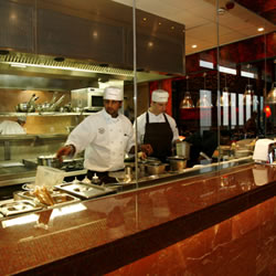 Behind glass walls the central kitchen is fully visible, allowing diners to watch as their dishes are prepared by the team of chefs.