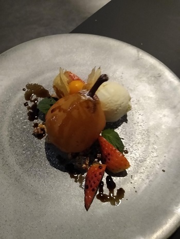 The poached pears with strawberry balsamic, candied walnuts, mint and berries was a big hit. Very comforting ( a hint of Christmas in this - cinnamon maybe?) and a range of tastes and textures. It's an unusual offering on the dessert menu, not one you would see in many places but one we would recommend you try.