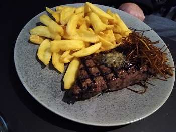 Steak and chips for the carnivore was well appreciated (£13.50) and cooked just as requested- medium rare... perhaps green veg or tomato could be added as it's not exactly a colourful plate, but no worries, it all got eaten with appreciative sounds being heard.