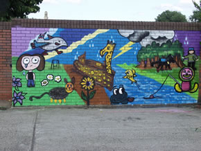 Photographs cannot capture the creativity of the moving image or the digital exploits of the groups. However the outputs of two of the workshops are shown in these images, Aerial Acrobatics and Graffiti Art. The Aerial Acrobats had to develop their mobility before they took to the air. The Graffiti Artists had to work at planning their end-result before they started painting. In every case the 'journey was as important as the destination' and everyone left, happier and more confident than when they arrived.
