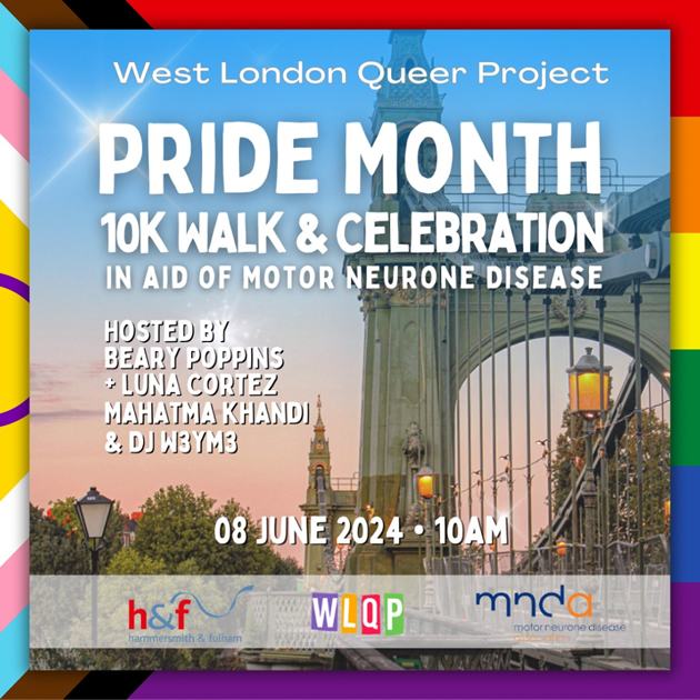 The West London Queer Project (WLQP) is thrilled to announce the upcoming 10K Walk & Celebration Event in aid of Motor Neurone Disease. During Pride Month on Saturday 8 June, it’s expected over 500 people will set off from Hammersmith and walk 10 kilometres around the river Thames followed by an afternoon of incredible entertainment from fantastic drag artists. The event aims to promote community wellness, celebrate physical activity, as well as raise awareness and funds for the Motor Neurone Disease Association of West London.