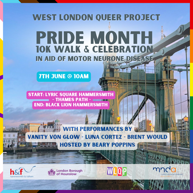 The West London Queer Project (WLQP) is thrilled to announce their 3rd annual ‘Pride Month 10K Walk & Celebration - In aid of Motor Neurone Disease’, on Saturday the 7th of June.