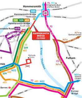 Bus passengers travelling southwards from Shepherd's Bush when Hammersmith Bridge is closed will need to break their journeys in Hammersmith and take a second bus – but should not swipe their Oyster cards again.