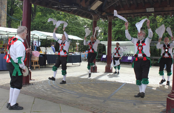 Greensleeves performed dances featuring a wide selection of Morris traditions to Bank Holiday crowds at various stops including Morden Hall Country Fair, Wimbledon Windmill tea shop, Wimbledon station forecourt and Merton Abbey Mills (below).