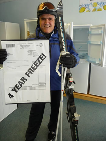 Councillor Alambritis (pictured right) donned ski gear and goggles to highlight his party's tax freeze promise at the manifesto launch, which took place at local independent fridge freezer shop Paul Electrical on Grand Drive in Lower Morden.
