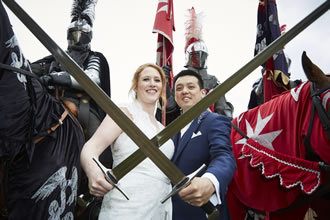 Hannah and Chi celebrate with medieval knights