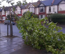 More than 100 public trees were lost in across the borough during the storms. The one on the left was in Kingston Road, Wimbledon.
