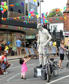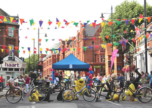 Wimbledon Hill Road was dressed with multi-coloured bunting, flags and balloons, and visitors were entertained by a live steel band and a 'Bicycle Ballet' performance.